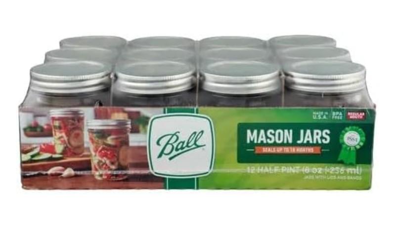 Walmart is offering the Ball Regular Mouth Mason Jars 8 oz. (12 Pack) - Half Pint Size Jars with Airtight Lids and Bands for Canning, Fermenting, Pickling, Meal Prep or DIY Decors for the best deal.