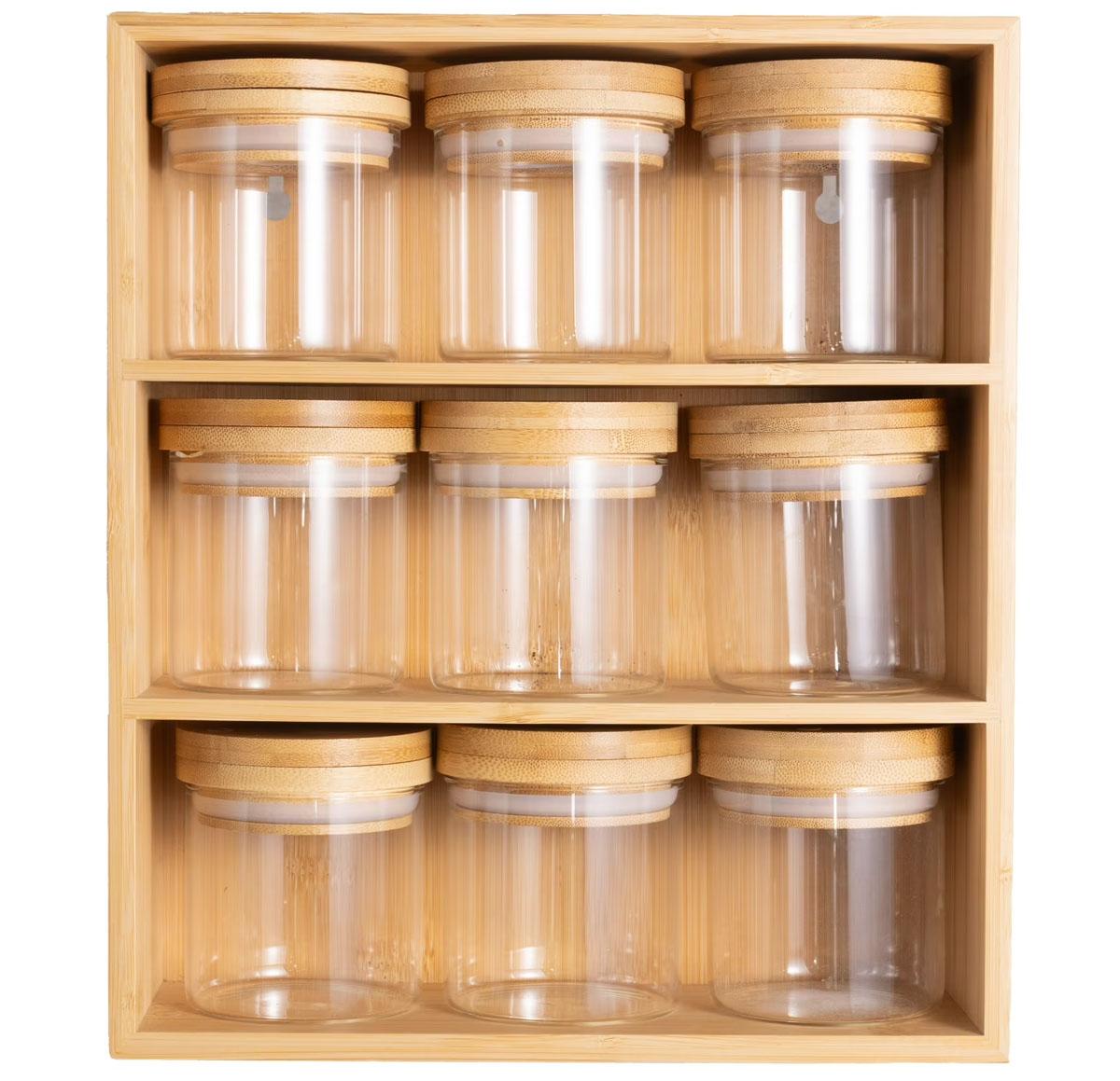 Walmart is offering the Better Homes & Gardens, Bamboo Holder with 9 Bamboo Swivel Lid Glass Spice Jars, 10 x 11.6 x 3.9 in for the best deal.