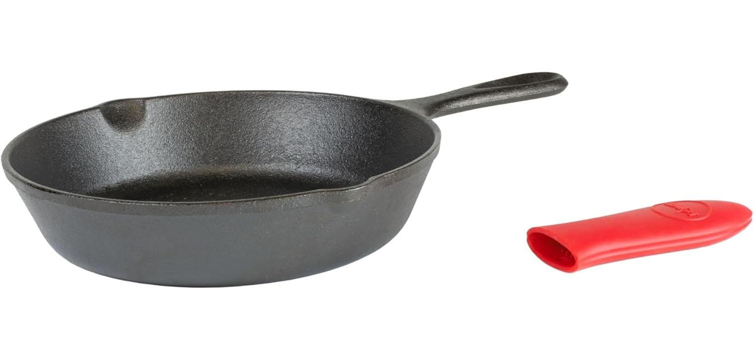 Amazon is offering the Lodge Cast Iron Skillet with Red Mini Silicone Hot Handle Holder, 8-inch for the best deal.