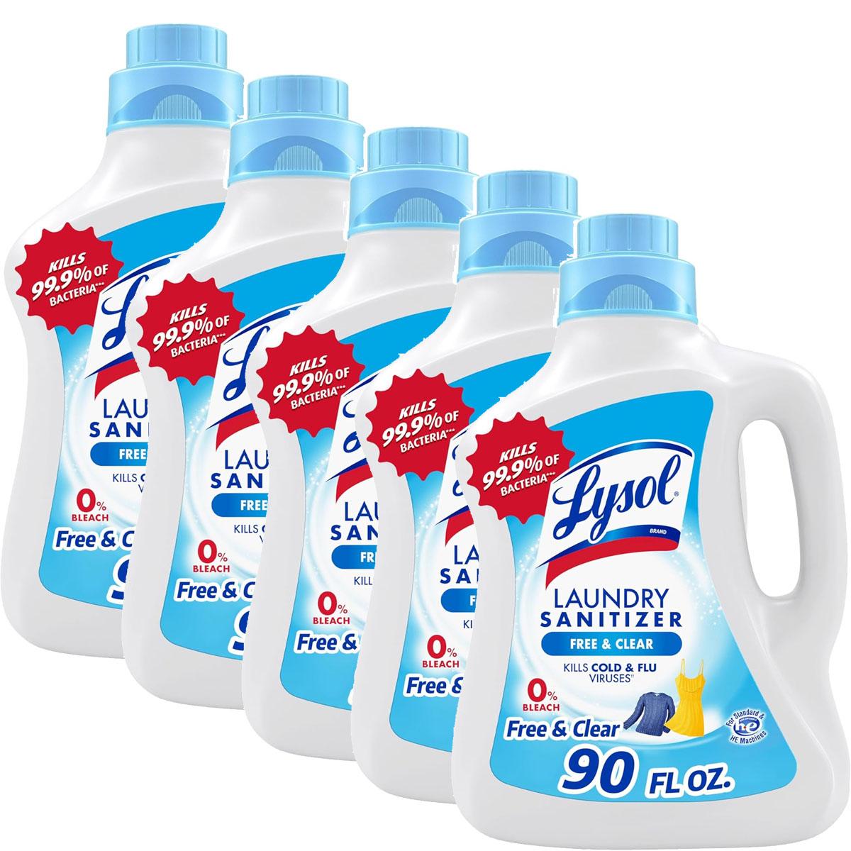 Amazon is offering the Lysol Laundry Sanitizer Additive, Free & Clear, Free from Fragrance and Dyes, 0% Bleach Laundry Sanitizer, Bacteria-causing Laundry Odor Eliminator, Unscented, 90 Fl Oz Pack of 5 for the best deal.