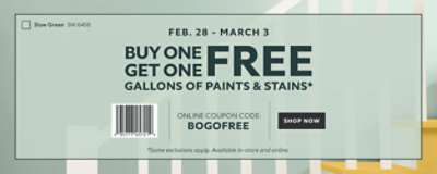 Sherwin Williams is offering Buy one, get one free select gallons of paints and stains