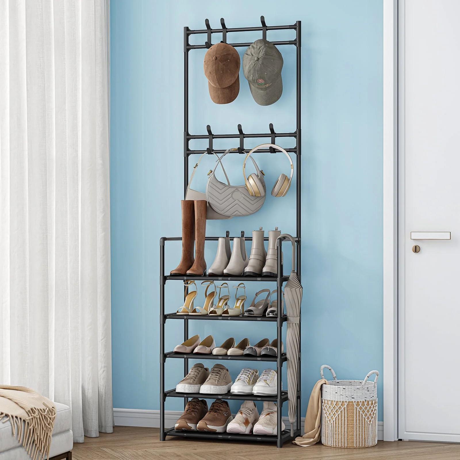 Walmart is offering the 5-Tier Shoe Rack with 6 Hooks, Free Standing Stackable Shoe Shelf Storage for Sneakers & Boots - Fits Closet, Entryway, Garage, Dorm, Small Spaces for the best deal.