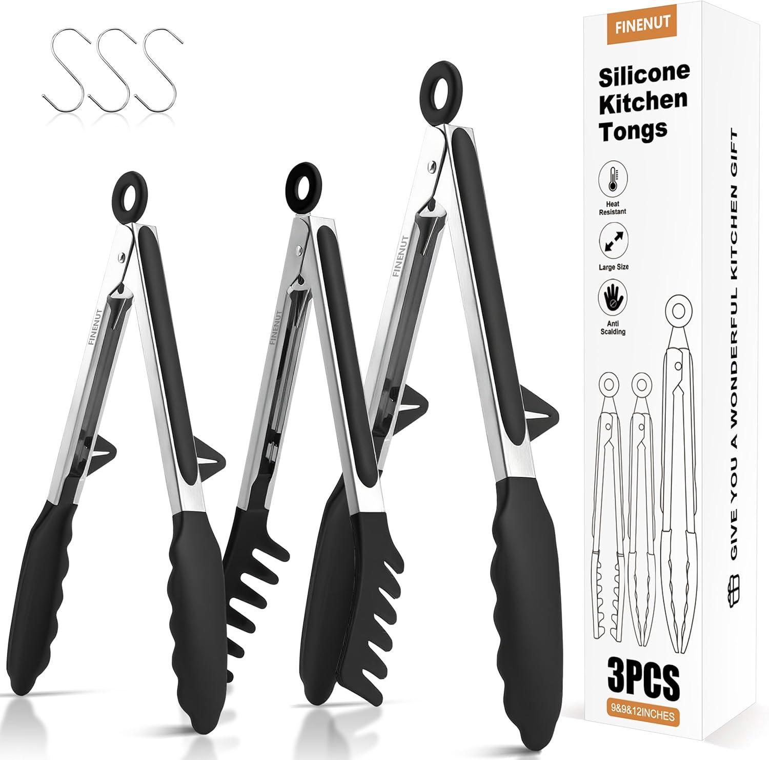 Amazon is offering the Finenut Stainless Steel & Silicone Food Tongs Set of 3 (9+9+12 Inch) - BPA-Free&Heat Resistant Non-Scratch BBQ&Cooking Tools,Strong Grip Locking for Grilling,Pasta,Air Fryer,Salad,Dishwasher Safe for the best deal.