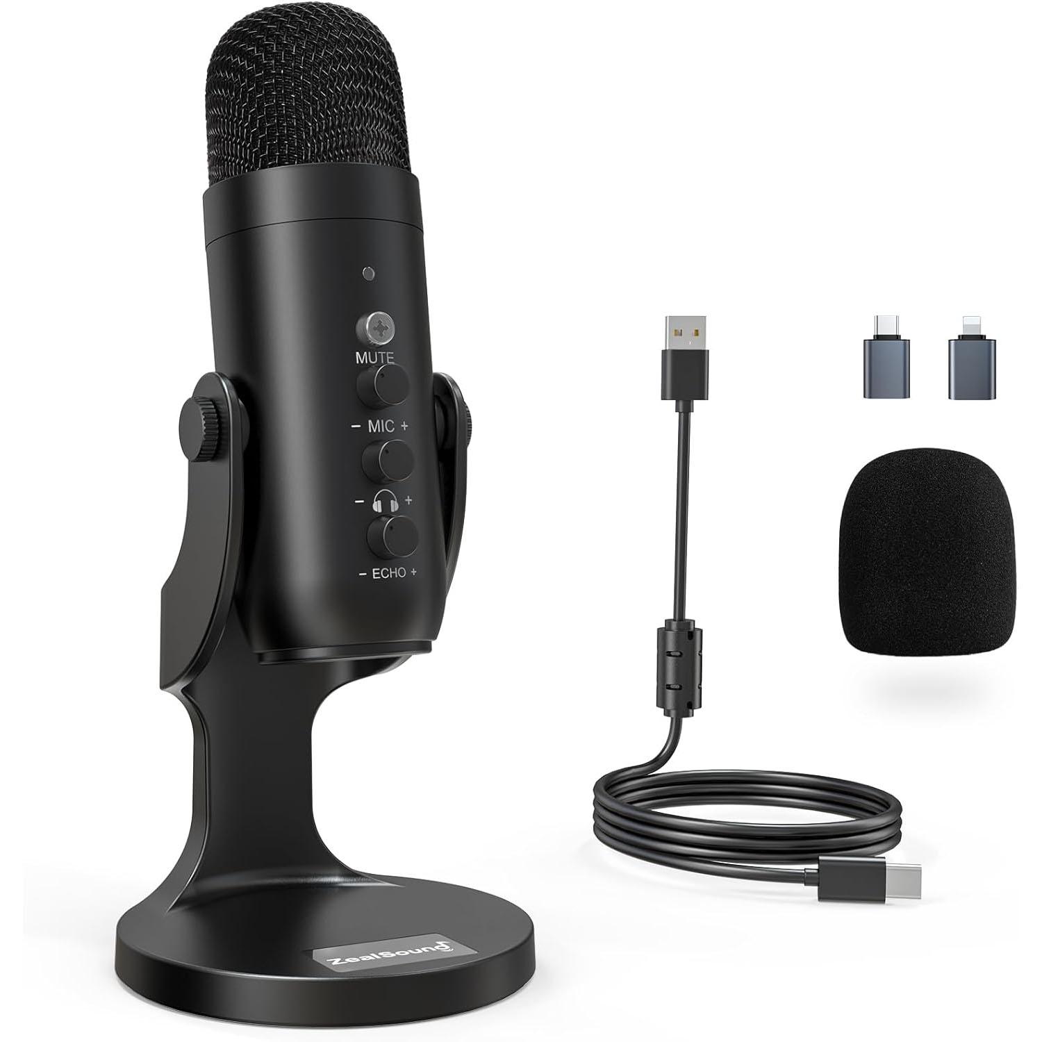 Amazon is offering the ZealSound Podcast Microphone for PC, Noise Cancellation USB Mic with Gain, Volume Adjustment & Mute Button, Monitoring & Echo, for YouTube, TikTok, Podcasting, Streaming, iPhone, iPad, Android, Mac for the best deal.